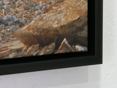 Canvas prints are made on the finest heavyweight matte white cotton-poly blend canvas without optical brighteners, ensuring stable and lifelike color rendition that won't fade prematurely. The edges of the image are copied, flipped, and added back to the image to create "gallery wrap" borders that mirror the edges of the image. The printed canvas is then stretched over 1.5 inch thick heavy-duty wooden bars to produce a dimensional artwork having the entire image on its face, with the mirrored edges wrapped around the sides of the stretcher bars. In many environments, these gallery-wrapped canvas prints stand out without further embellishment, creating a bold, contemporary look that demands attention. Optional 2.25 inch deep satin black wood floater frames add a thin, elegant accent around the art that works well in more formal settings. Matte canvas prints look particularly stunning without any protective coating - their complete absence of reflected glare or shine gives them an amazing appearance of depth and immediacy from any viewing position. Visitors to Better Light's print gallery often remark that they feel like they could just walk into these large, glare-free prints, although we advise against trying this. Uncoated canvas prints should still provide excellent print life without significant fading, but their ink-receptive surfaces can still absorb dirt or liquids that might cause discoloration, and the matte printed surface is more susceptible to scuffing or similar damage. To maintain their impressive impact, uncoated canvas prints should be hung where they can be admired without being subject to touching, scraping, dirt, or moisture. These prints can optionally be coated with a layer of clear varnish to seal their ink-receptive surfaces and provide some protection against physical damage. Coating the printed canvas invariably adds some sheen to its surface, producing reflections that reduce the clarity of darker areas and make the print look flatter. Coated canvas prints are slightly more robust than uncoated prints, but they should still be hung in a protected environment like other fine art. |